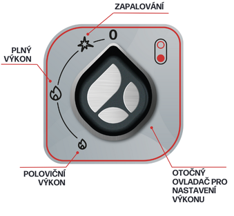 0 - vypnutý ohrev / Iskra - zapaľovanie / Veľký plameň - plný výkon / Malý plameň - polovičný výkon