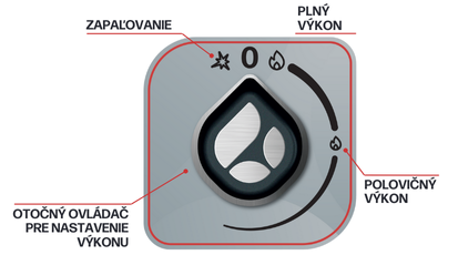 0 - vypnutý ohrev / Iskra - zapaľovanie / Veľký plameň - plný výkon / Malý plameň - polovičný výkon